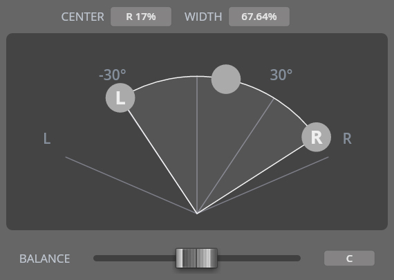 Power panning lets you define individual values for the signal width and center position. Naturally, the latter can only be changed if the signal width is less than 100%. Drag the handles to adjust width and center, or enter values in the respective fields.