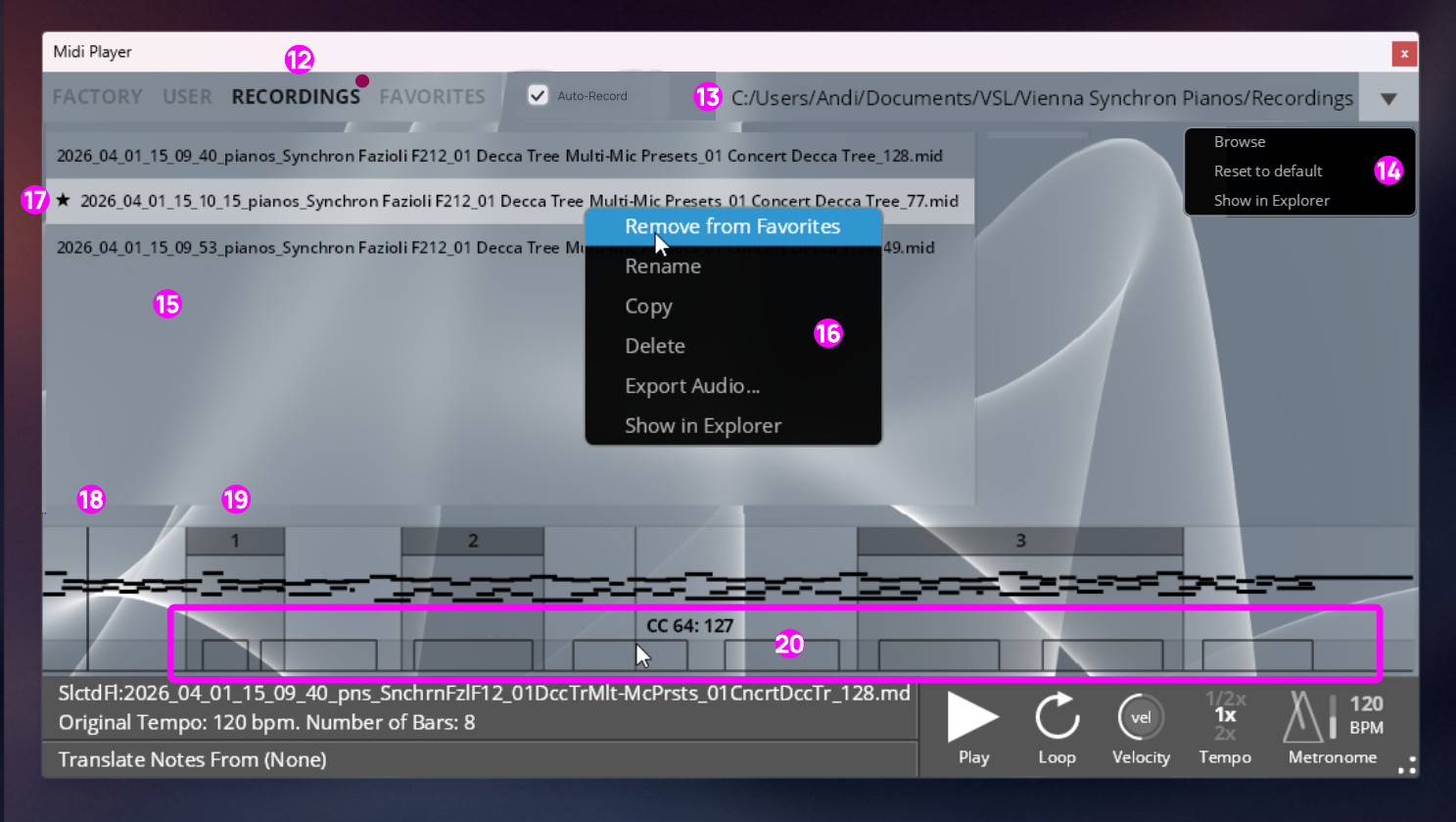 Standalone only: Red dot indicates recording. Minimum notes played: 5File Selection Menu: Factory offers MIDI performances; User shows manually imported MIDI Files; Recordings shows recordings made in Standalone mode; Favorites shows all files marked as favorites.