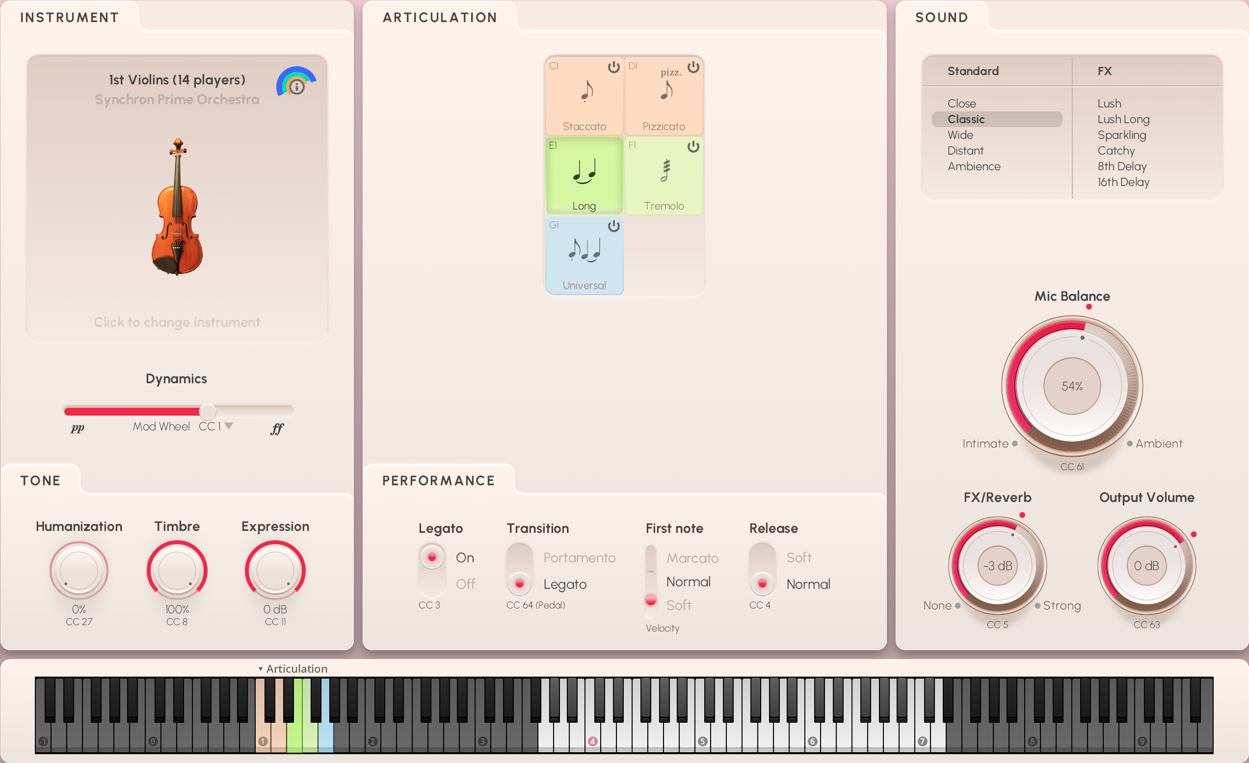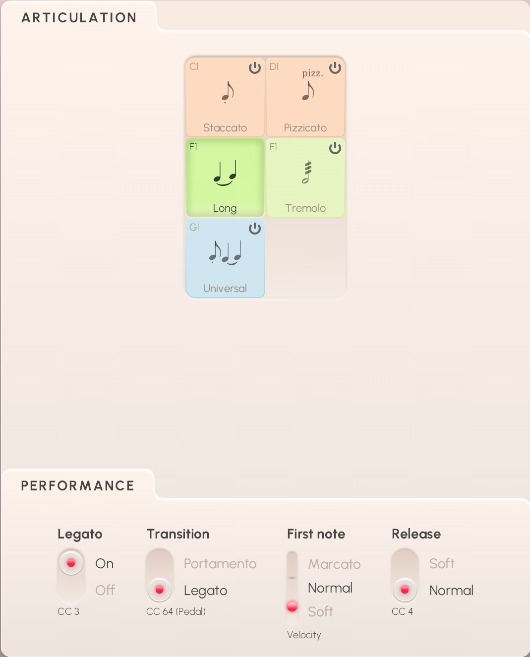 Legato can be switched on and off with MIDI CC3. If you select the “Universal” articulation, MIDI CC3 will be represented by a fader knob instead of a switch to blend tremolo and legato notes.
