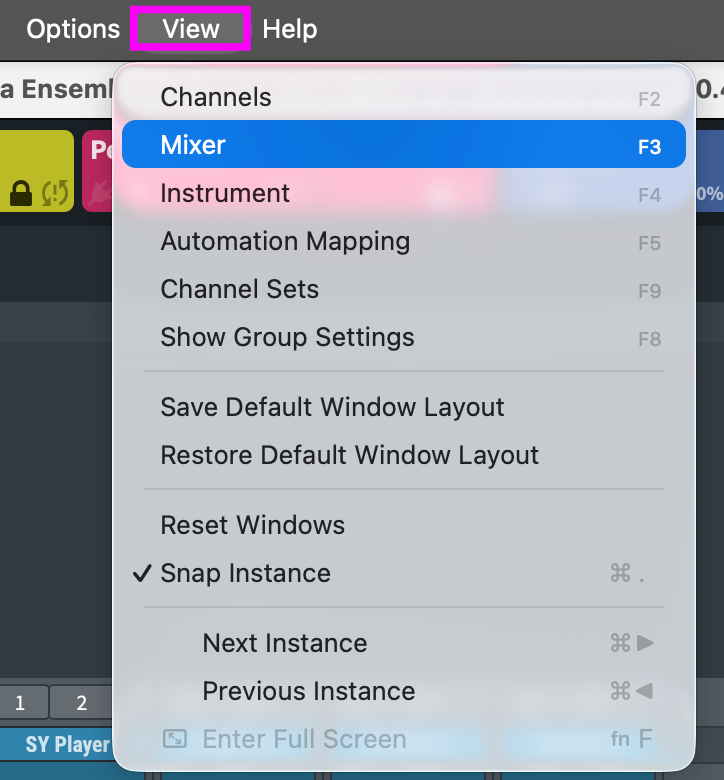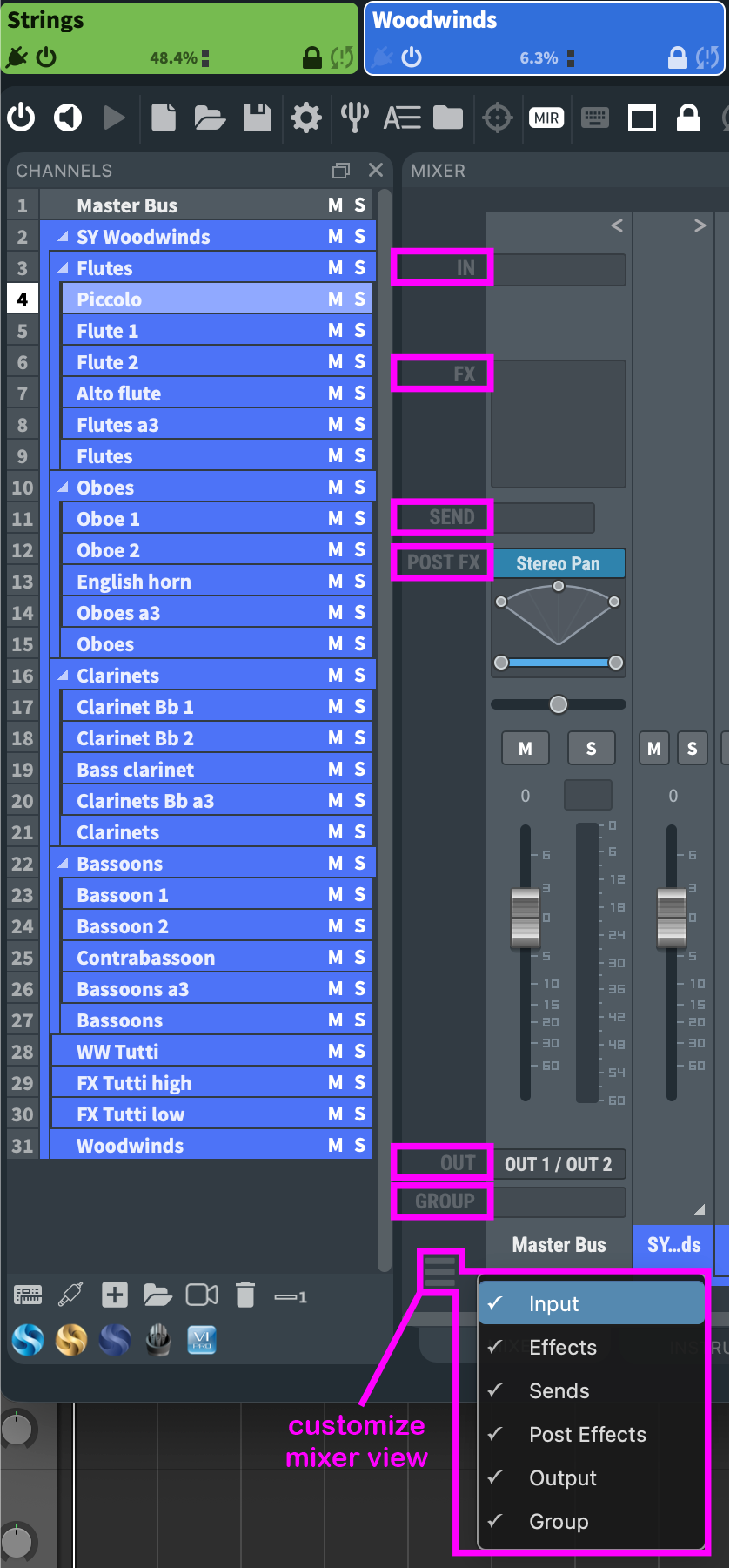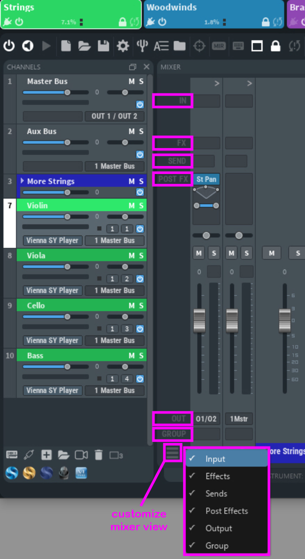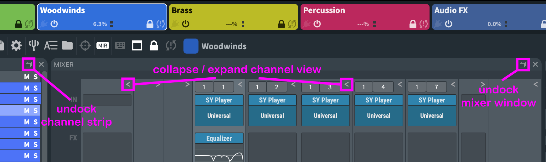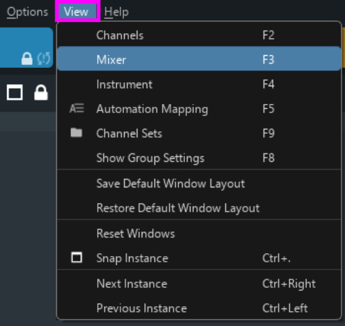 It is possible to undock the Mixer, the Channel Pane, Automation Mapping, the interfaces of all virtual instruments, and MIR Pro (if available) to use these windows in separate windows (or on a second screen). To customize your mixer view, choose which mixer elements should be displayed in the lower-left corner of the mixer:
