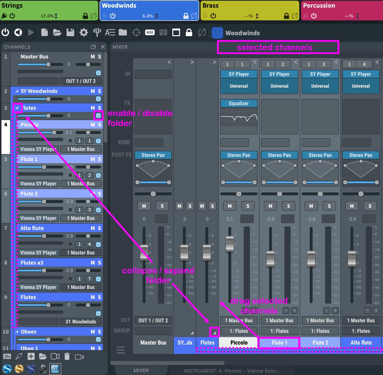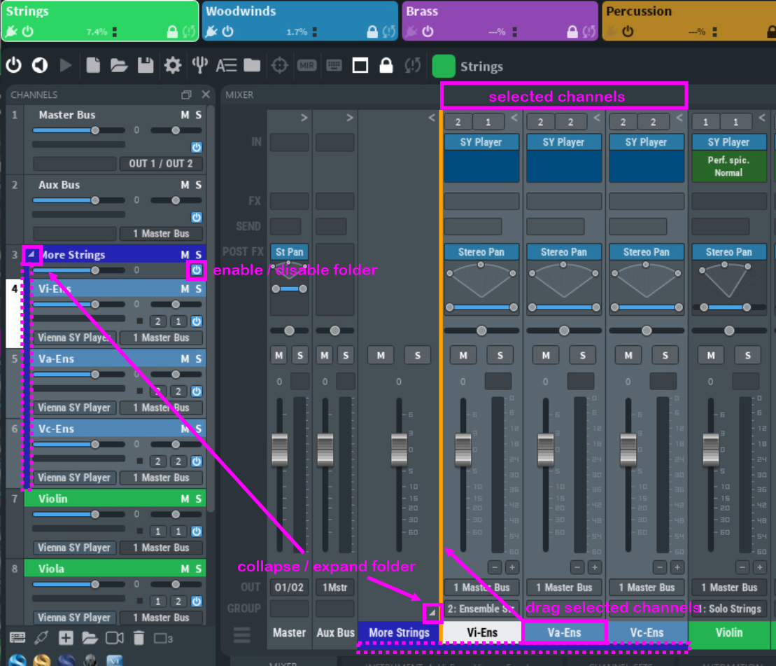 You can expand and minimize each folder by clicking the small arrow in the folder channel. You can now also enable and disable folders, and this feature is automatable, too! Each folder will create an extra line for orientation, which will be displayed in the color of the folder.