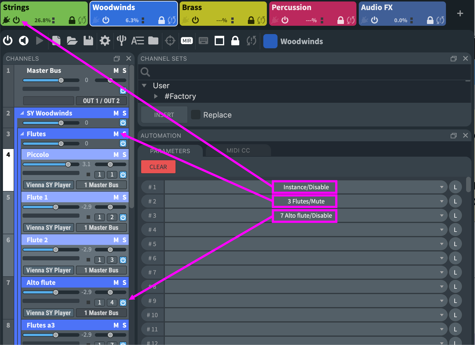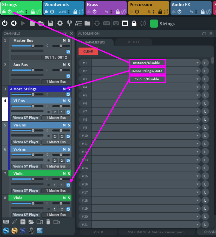 Enabling and disabling Vienna Ensemble Pro instances and folders unloads all plug-ins and their allocated memory from the selected channel(s) while keeping data intact. As with individual channels, the power button will initiate unloading the sample content of the contained tracks, while keeping the sample location stored. This way, you can free up your RAM and CPU while being able to reload all plug-ins just like you left them. You can also automate enabling/disabling instances, folders, and channels with Vienna Ensemble Pro's Parameter Automation, so you are able to load certain setups while your project is playing back.