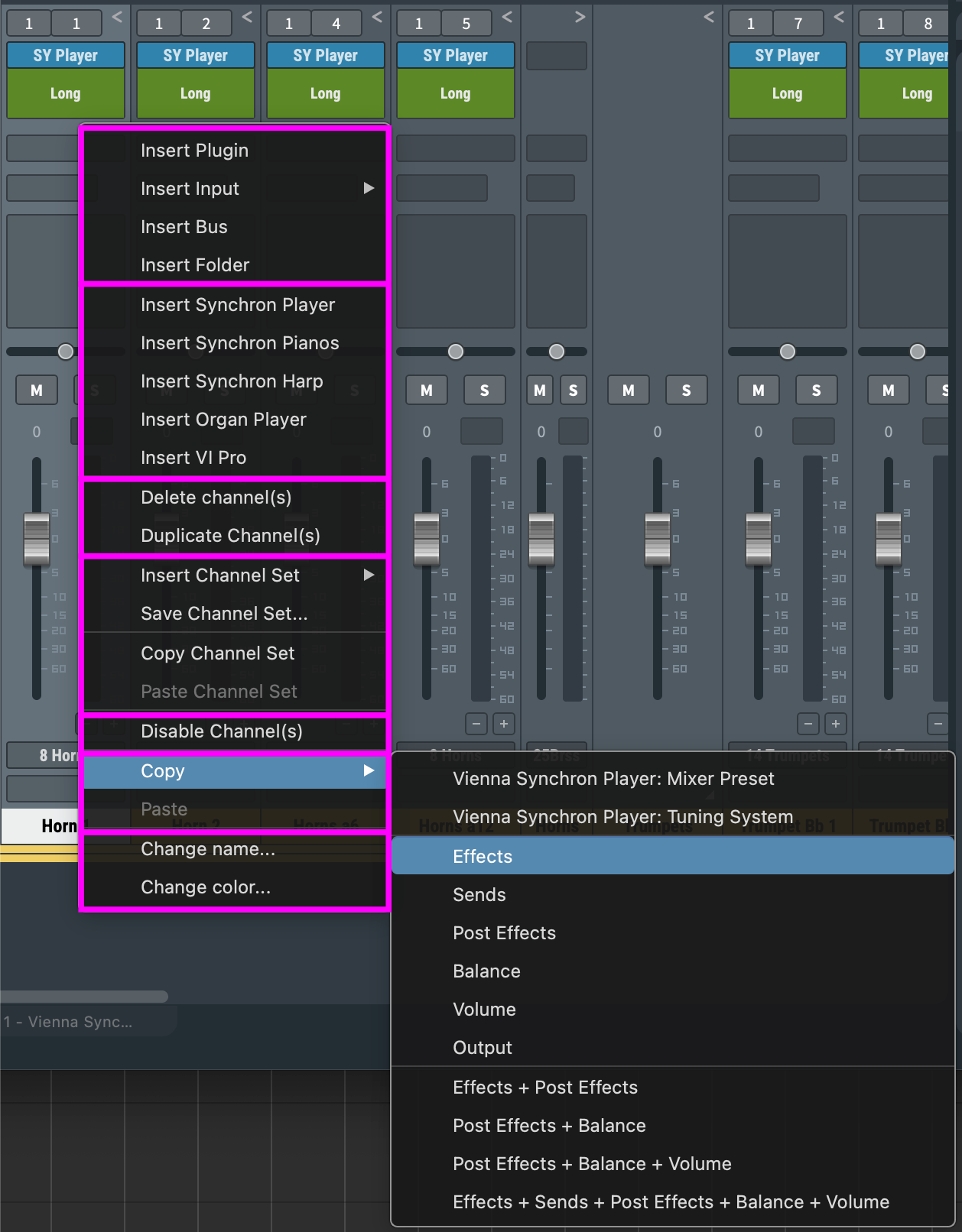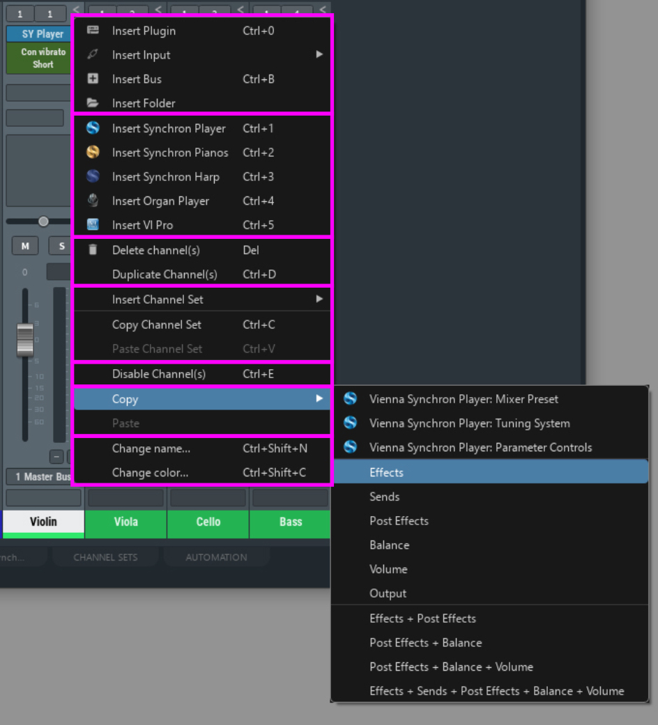 Insert plugins, inputs, busses, folders