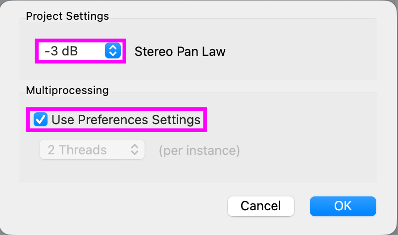 There also is the option to set a pan law both as a default setting and a per-project setting, which applies to all included panning plug-ins. Likewise, you can set threads preferences per project.