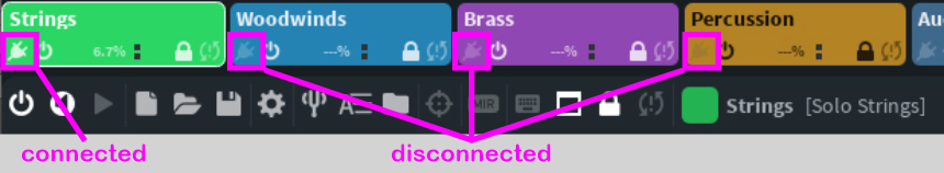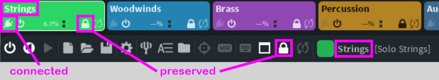 As you can see, the preserved instance "Strings" is still CONNECTED with the song in your sequencer, while the other instances currently have no connection.