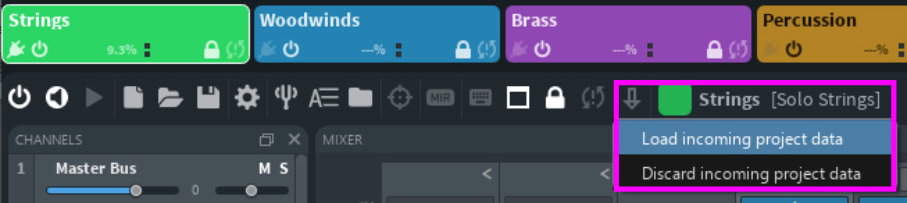Try this example yourself: After you have preserved the "Strings" instance and saved your Song #1 and Song #2 with Preserve Instance, you can load either Song #1 or Song #2, and it will automatically connect to your preserved "Strings" instance. The name "Strings" is the only indicator that the loaded setup is correct. For safety, your sequencer has also saved all information of the loaded instance, and when connecting to another Vienna Ensemble Pro instance, this data can be loaded or discarded in this instance with the load/discard plugin data button. If you have changed any settings in your template or if you are not sure, please click Load plugin data. Your sequencer will "push" the data to your Vienna Ensemble Pro.