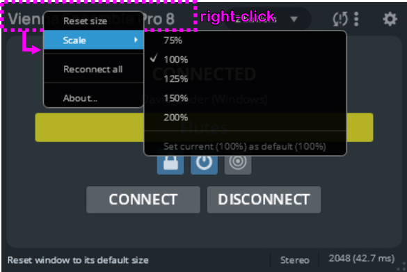 Right-clicking in the menu bar provides you with another context menu, providing scaling options and the practical feature to Reconnect all instances in a project.