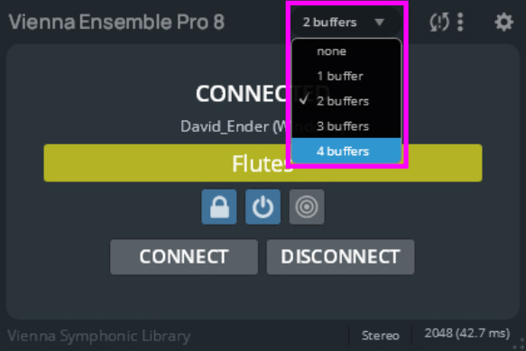 Setting Latency to "none" will synchronize Vienna Ensemble Pro with your sound card, so that no latency is added – while very good for recording percussive sounds, this also adds a lot of strain to the CPU. Setting Latency to "1 buffer" will add one buffer to your sound card latency. If your sound card latency is, e.g., 256 Samples, your latency when playing live will be 512 samples. Setting Latency to "2 buffers" will add 2 buffers to your sound card latency. If your sound card latency is, e.g., 256 Samples, your latency when playing live will be 768 samples.
