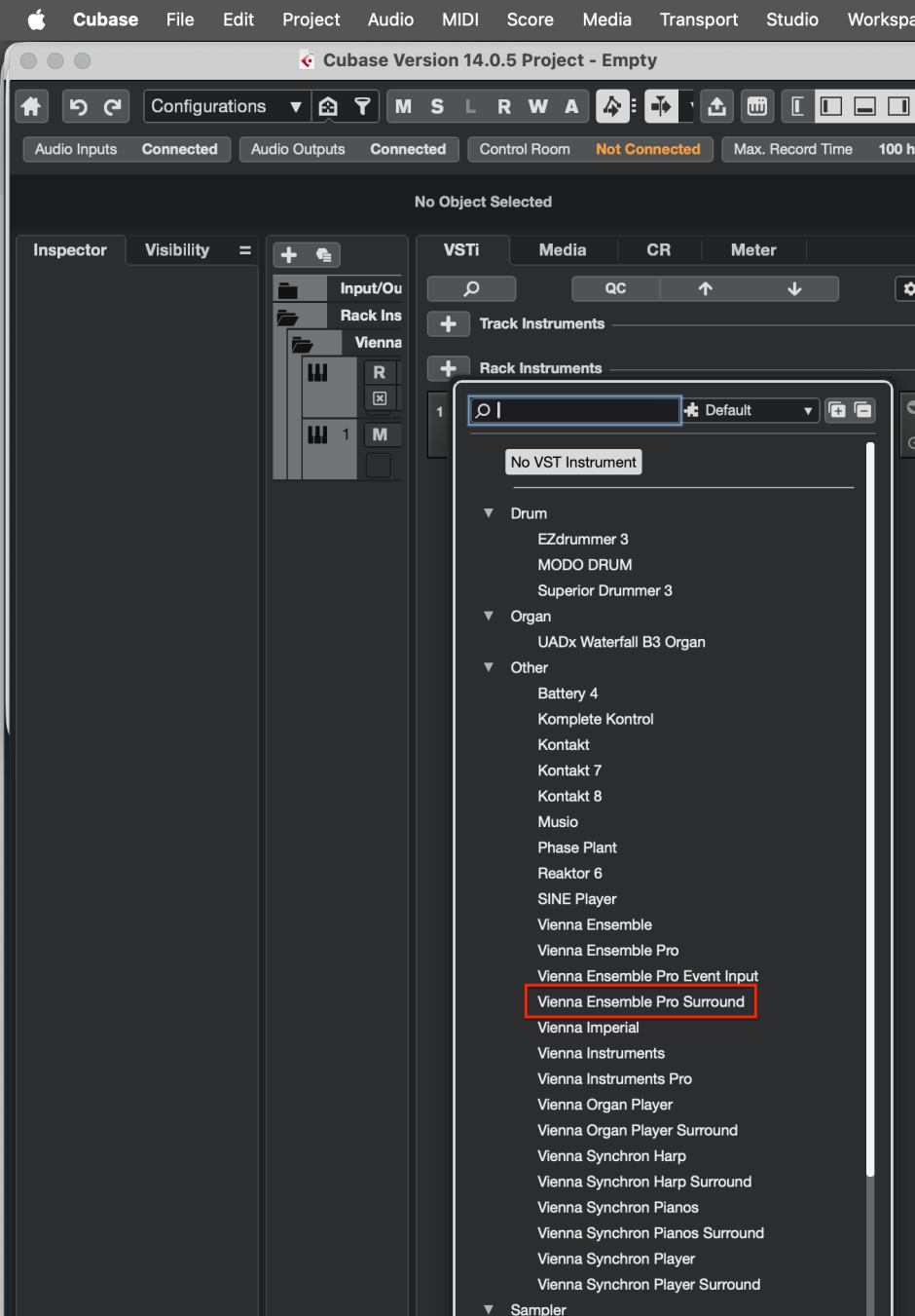 A) Creating a new instance from a Vienna Ensemble Pro Plug-in. The channel configuration will be adapted from the channel configuration of the plug-in – so make sure that you have inserted a Surround Vienna Ensemble Pro plug-in in your sequencer.