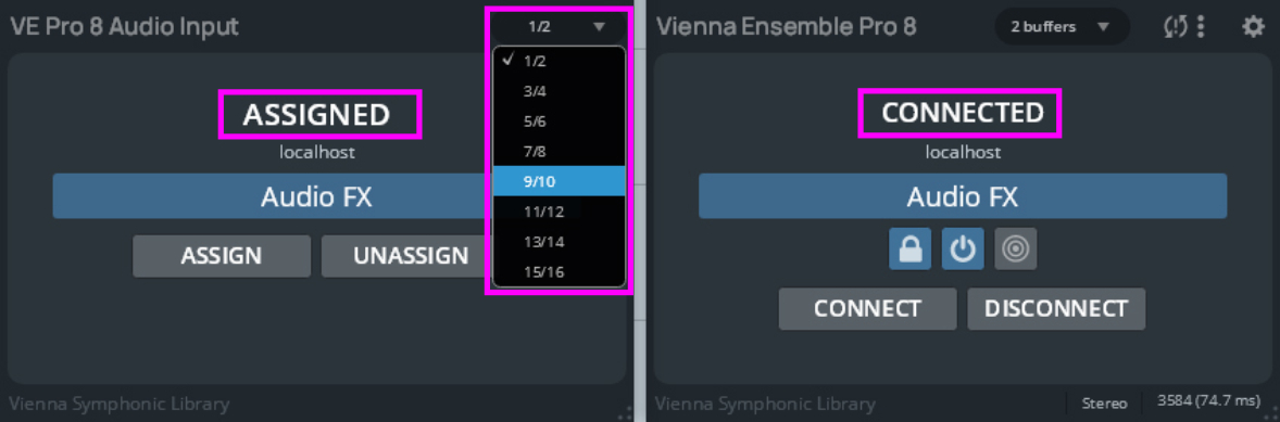 Each Vienna Ensemble Pro Plug-in can connect to one instance of Vienna Ensemble Pro, and of course, you can use multiple Vienna Ensemble Pro plug-ins to connect to multiple Vienna Ensemble Pro instances!