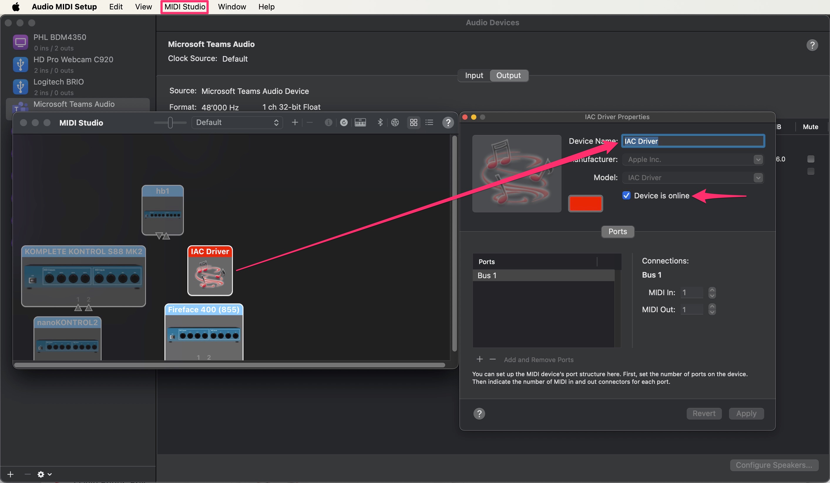 In the MIDI Studio, select IAC Driver and set your Device name