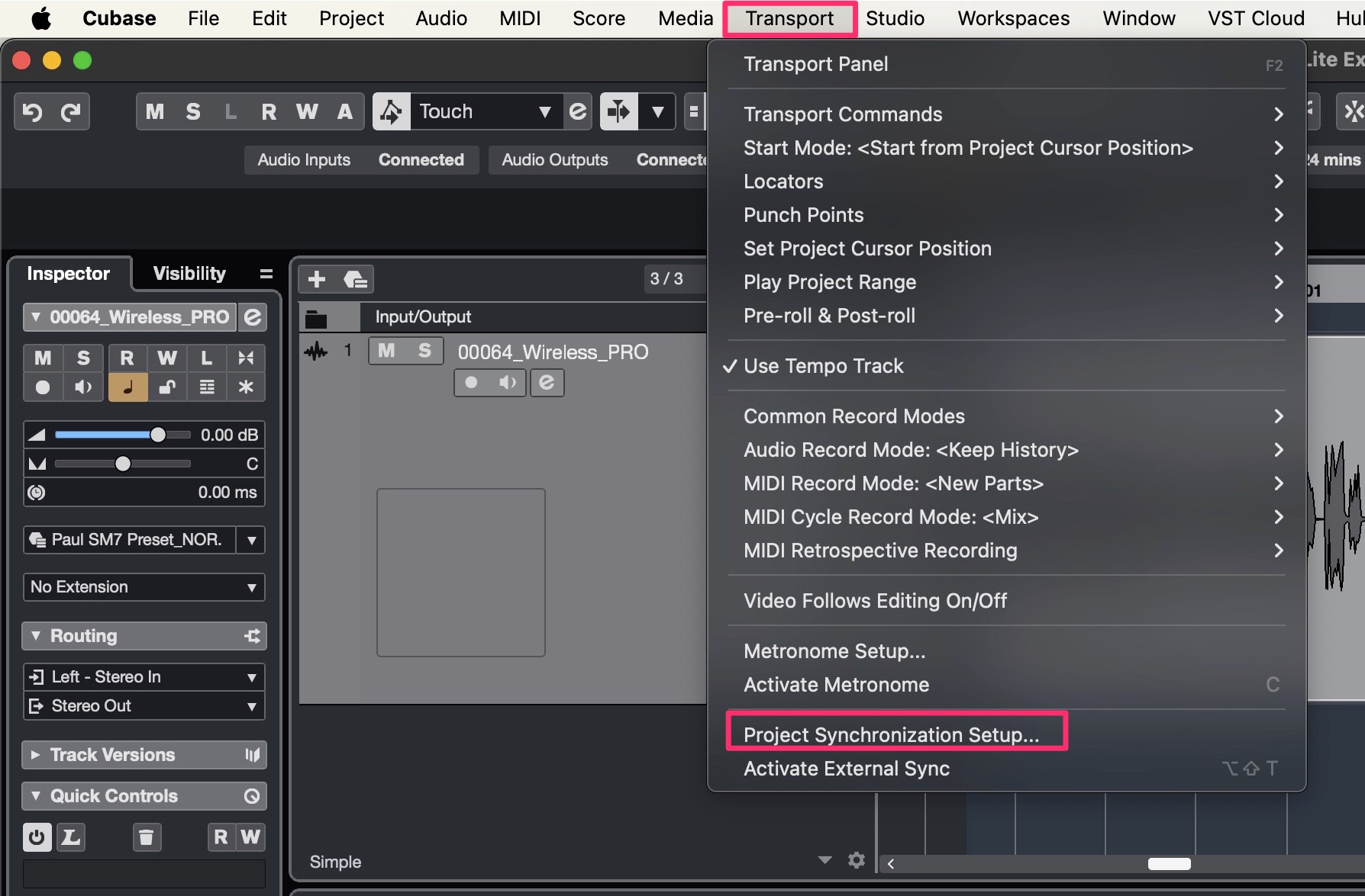 In Cubase, select Project Synchronization Setup under Transport.