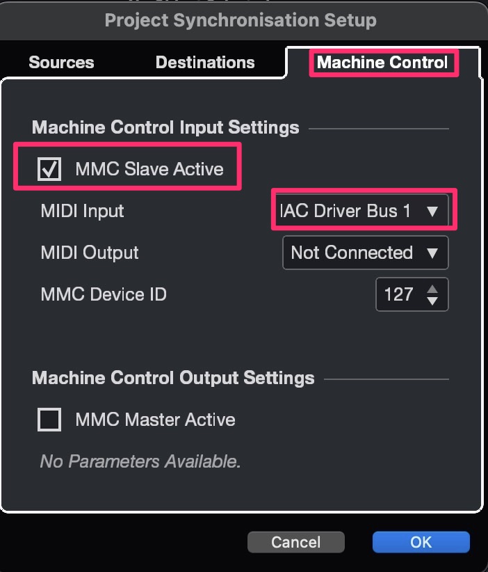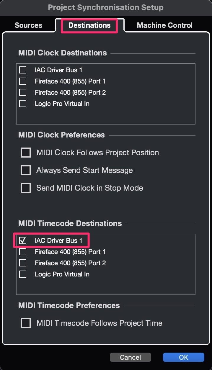 Also, select an IAC Driver Bus as a Destination and activate MTC (MIDI Time Control).