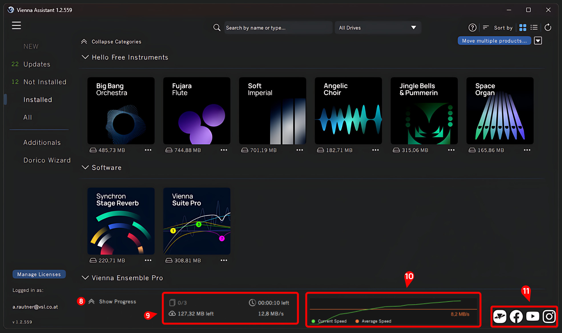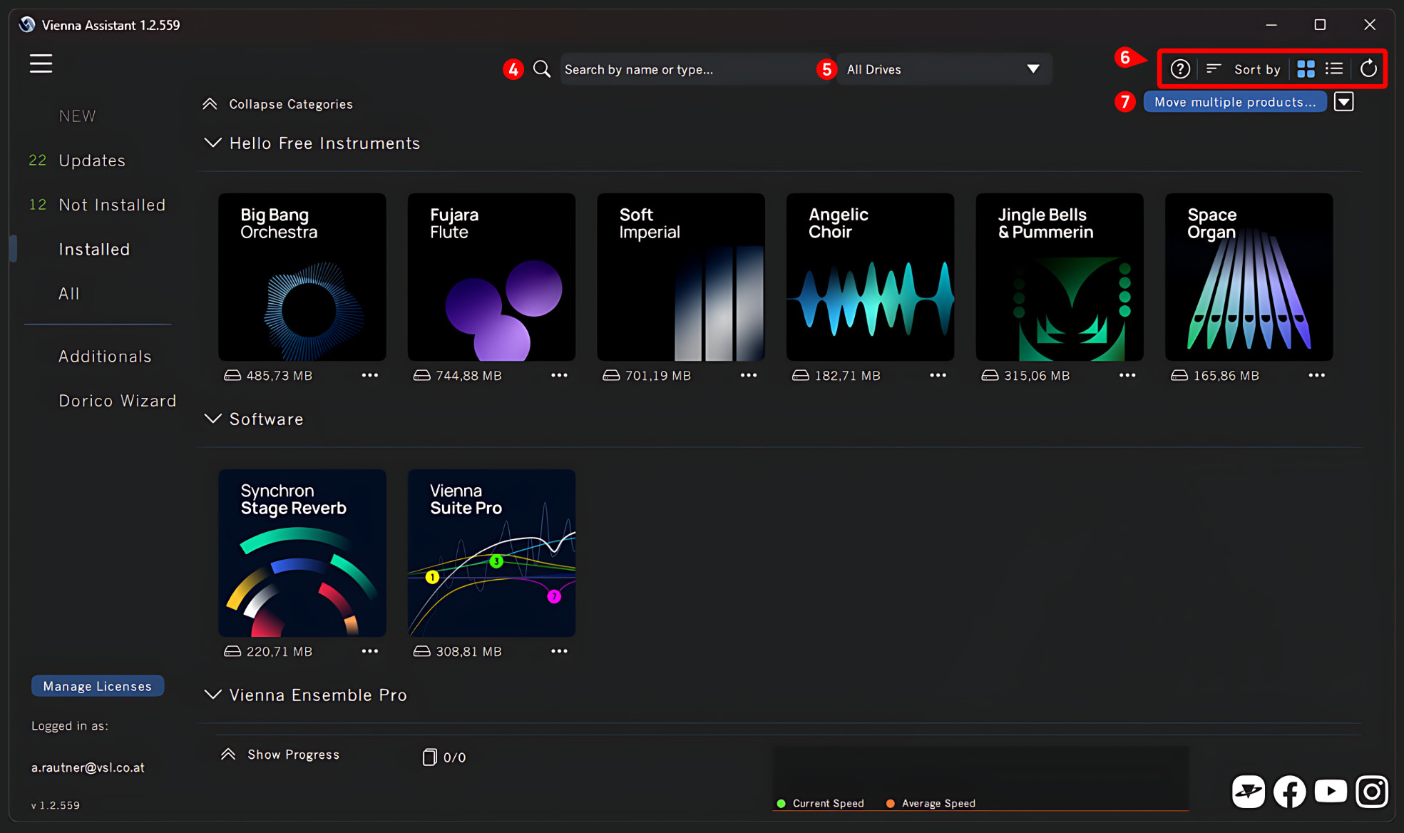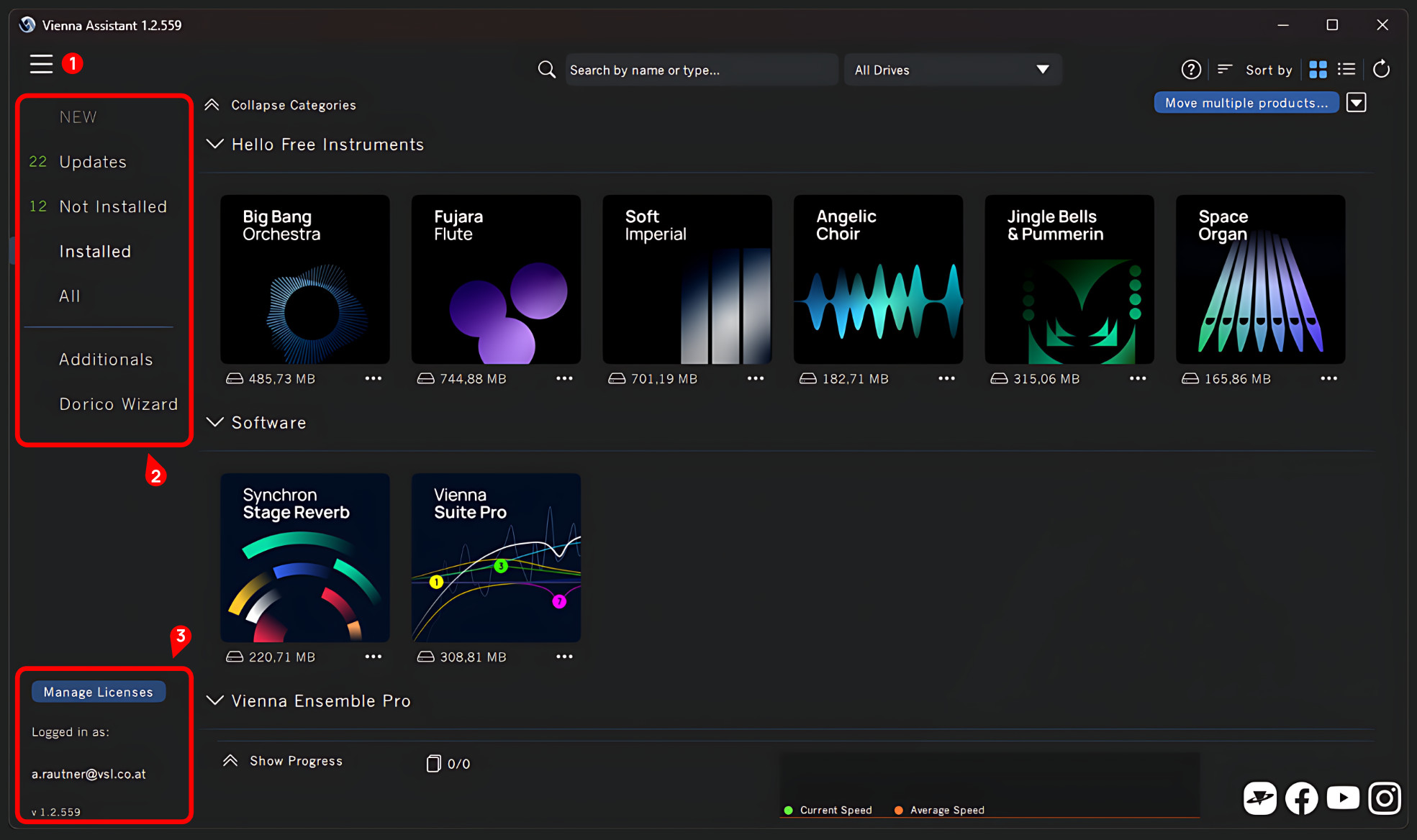 The bottom (3) of the sidebar allows quick access to the iLok License Manager via the 'Manage Licenses' button and information about the current user login, which we will use as the Vienna Assistant software version.